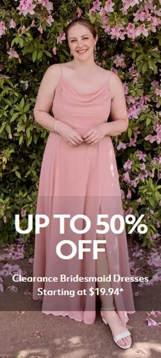 Stop by and take up to 50% off on clearance bridesmaid dresses starting at $19.94 in store.