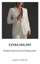 Offer valid for orders placed July 1, 2025 through 11:59 pm ET on November 24, 2025 at David's Bridal stores in the United States. Availability differs by store. Valid on select Junior Reg styles in dept 24. Excludes Clearance, Perfectly Imperfect styles, sale styles, prior sales and existing layaways. Can be combined with Diamond Loyalty and 10% off Ecom, but not with any other offers or discounts. Discount taken at register.